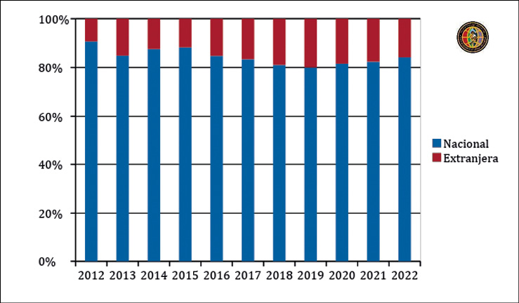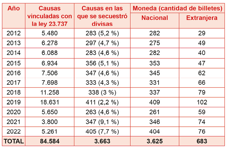 La Tabla N° 1 presenta el total de causas registradas por infracción a la Ley 23.737 entre 2012 y 2022, y distingue aquellas en las que se secuestraron divisas. Se informa además la cantidad de billetes de moneda nacional y extranjera incautados por año. Observamos que, en ese intervalo de 2012 a 2022, la proporción de moneda nacional secuestrada es cinco veces mayor que la moneda extranjera. Si bien esta relación varía entre años, la predominancia de moneda nacional se mantiene constante a lo largo del período analizado.