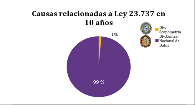 En los registros internos de la División Scopometría, se observó que en los últimos diez años se realizaron un total de 1988 informes periciales, una media de 198,8 pericias por año. Del total, solo el 3,14% se relaciona con la infracción a la Ley 23.737. E muestra un bajo porcentaje de realización de informes periciales referentes a causas que involucren drogas, con respecto a otras causas (Gráfico N° 1).
