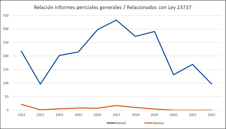 Gráfico N° 1. Comparación anual entre informes periciales generales (en azul) y relacionados con la Ley 23.737 (en naranja).