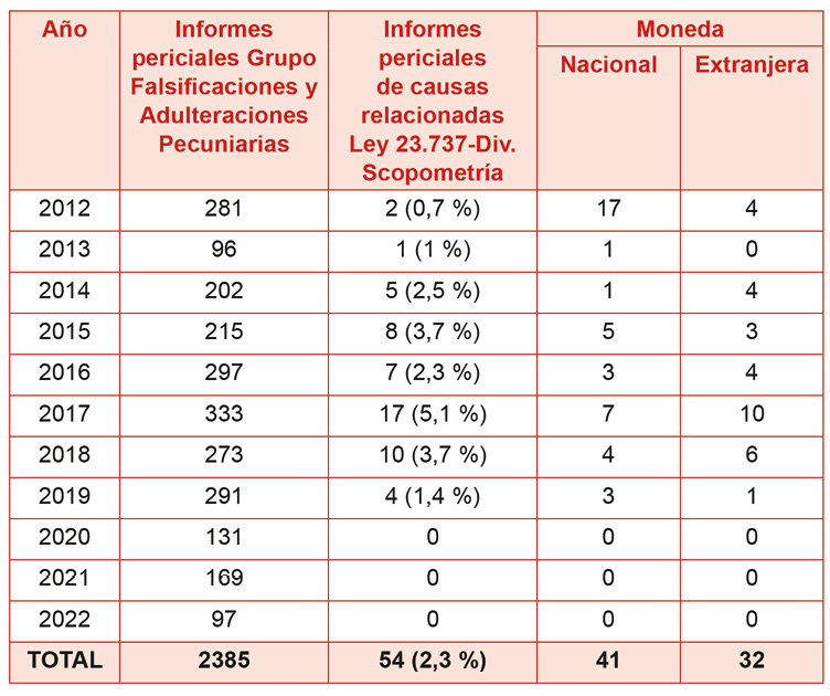 En el período 2012-2022, la División Scopometría realizó un total de 2.385 informes periciales, cuyos interrogantes radicaron en la determinación de autenticidad o falsedad del material aportado para estudio. Cincuenta y cuatro causas estuvieron relacionadas, acorde a la Carátula aportada, a Infracción de Ley 23.737.
