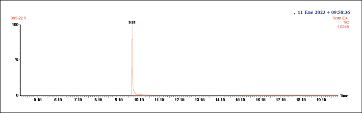 Figura N° 18. Espectro de masas del compuesto eluído a 10.02 minutos.