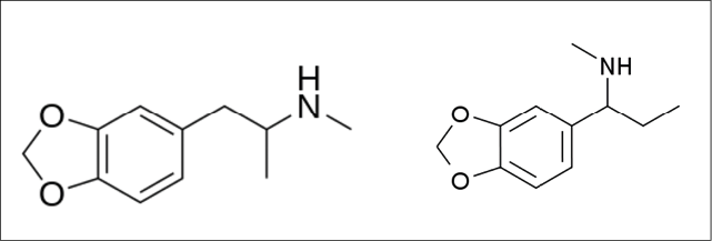 El éxtasis, o MDMA, es una sustancia estimulante de tipo anfetamínico que puede producir diversos síntomas según la dosis consumida, incluyendo aumento del estado de alerta y euforia, incremento de la frecuencia cardíaca, presión arterial, respiración y temperatura corporal, así como agitación, temblores, hipertensión, pérdida de memoria y alucinaciones (Holland, 2001; Müller & Borgwardt, 2018). El M-ALPHA, un isómero de posición del MDMA, también posee actividad estimulante y empatógena, habiéndose reportado su aparición en 2010 (United Nations Office on Drugs and Crime, 2019). La estructura del M-ALPHA en comparación con el MDMA muestra que la posición del grupo N más cerca del anillo lo diferencia de una fenetilamina, aunque sus efectos sean similares. La Figura 16 presenta una comparación de las estructuras químicas de la 3,4-metilendioximetanfetamina y el M-ALPHA.