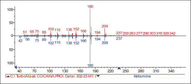 La Muestra 5, descrita como polvo rosa y comúnmente conocida como tusi o cocaína rosa, fue analizada preliminarmente por TLC, lo que sugirió la presencia de un principio químico derivado de anfetaminas y otro relacionado con la ketamina. El análisis por GC-MS de esta muestra reveló una mezcla de dos compuestos. Se identificaron como MDMA y ketamina, con una coincidencia del 91% y 93%, respectivamente. Este resultado no se correspondió con la sustancia esperada, que generalmente se asocia con la 4-bromo-2,5-dimetoxifeniletilamina (2C-B). Sin embargo, es frecuente que las sustancias incautadas comercializadas como 2C-B no contengan esta sustancia, sino mezclas que simulan sus efectos, como MDMA y ketamina. El cromatograma de la Muestra 5 se muestra en la Figura N° 17. Los espectros de masas de los compuestos eluídos a 10.02 y 12.98 minutos se presentan en las Figuras N° 18 y 19, respectivamente. La comparación del espectro de masas del primer compuesto con el del MDMA se muestra en la Figura N° 20, y la comparación del cromatograma del segundo compuesto con el de la ketamina en la Figura N° 21.
