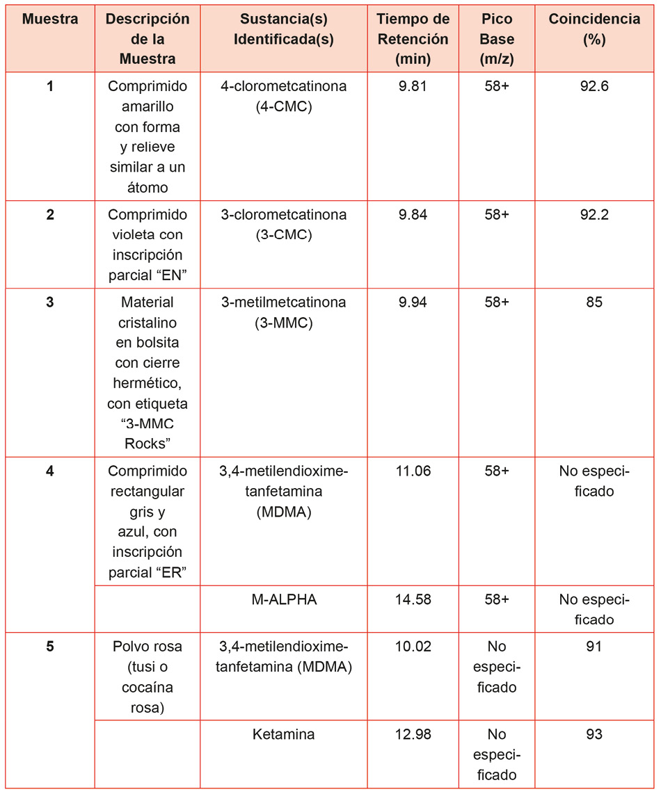 Los análisis realizados sobre cinco muestras incautadas por las fuerzas de seguridad revelaron la presencia de diversas Nuevas Sustancias Psicoactivas (NPS) y mezclas, utilizando las metodologías descritas. Los hallazgos principales se resumen a continuación y se detallan en la Tabla N° 2.